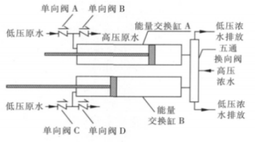 低壓原水從單向閥 A 或單向閥 C 進(jìn)入能量回收裝置,充滿能量交換缸 A 或 能量交換缸 B;高壓濃水從五通換向閥進(jìn)入能量回收裝置,當(dāng)五通換向閥使高 壓濃水與能量交換缸 A 連通時(shí),高壓濃水將能量傳遞給低壓原水,實(shí)現(xiàn)能量交 換,高壓原水從單向閥 B 進(jìn)入反滲透膜壓力容器進(jìn)行脫鹽處理;待將能量交換 缸 A 中的原水全部加壓送至反滲透系統(tǒng)后,五通換向閥,將高壓濃水與能量交 換缸 B 連通,重復(fù)上述能量交換過程,同時(shí)能量交換缸 A 中低壓原水進(jìn)入,排 出低壓濃水。兩個(gè)能量交換缸交替進(jìn)行高壓濃水與低壓原水的能量交換,實(shí)現(xiàn) 將低壓原水連續(xù)增壓送至反滲透系統(tǒng)進(jìn)行脫鹽處理。