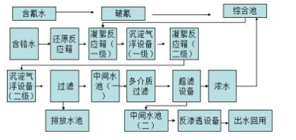 采用物理化學(xué)方法對電鍍廢水中的重金屬進行分離處理,通過兩次調(diào)節(jié)廢 水的 pH 值,使廢水中堿性重金屬離子和中性重金屬離子分別在其最佳的沉淀 環(huán)境內(nèi)進行沉淀分離, 達到去除重金屬的目的,使廢水達到《電鍍污染物排放 標(biāo)準(zhǔn)》(GB21900-2008)中的標(biāo)準(zhǔn),再對達標(biāo)的廢水進行雙膜法(超濾膜+反 滲透膜)分離,進一步去除水中的各類金屬離子,反滲透膜清水側(cè)出水達到電 鍍清洗工藝用水水質(zhì)標(biāo)準(zhǔn),回用于電鍍生產(chǎn)線,反滲透濃水側(cè)出水再經(jīng)過一次 物化沉淀,最終使?jié)馑_標(biāo)排放。