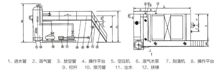 工作原理:在一定條件下,將大量空氣溶于水中,形成溶氣水,作為工作介質(zhì),通過(guò)釋放器驟然減壓快速釋放,產(chǎn)生大量微細(xì)氣泡粘附于經(jīng)過(guò)混凝反應(yīng)后廢水中的“礬花”上使絮體上浮,從而迅速地除去水中的污染物質(zhì)達(dá)到凈水的目的,詳見(jiàn)工藝流程圖。