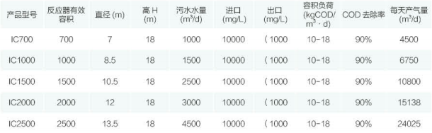 IC厭氧反應(yīng)器由于存在著強(qiáng)大的內(nèi)循環(huán)、傳質(zhì)效果好、生物量大、其容積負(fù)荷遠(yuǎn)比普通的UASB 反應(yīng)器高, 一般可高出3倍左右。處理高濃度有機(jī)廢水,當(dāng)COD 為10000-15000mg/L 時(shí),容積負(fù)荷率可達(dá)10-18CODm3·d。
